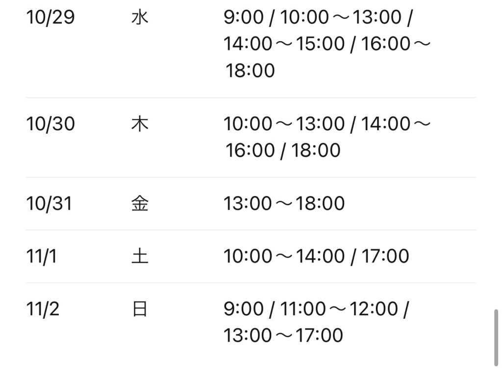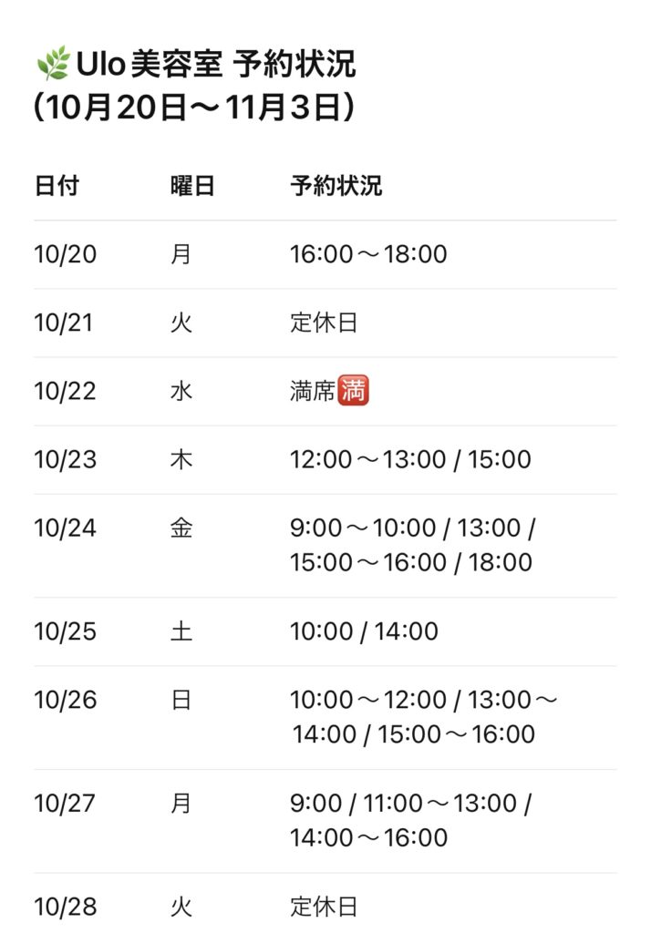 🌿Ulo美容室 予約状況(10月20日〜11月2日)