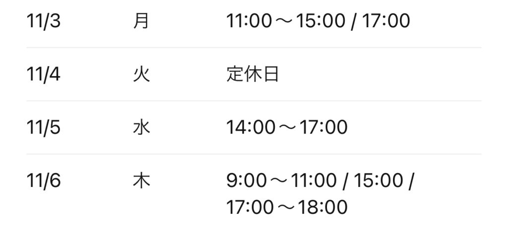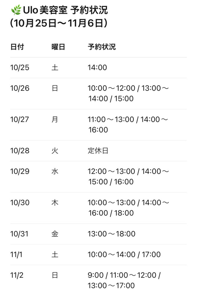 🌿Ulo美容室 予約状況(10月25日〜11月6日)