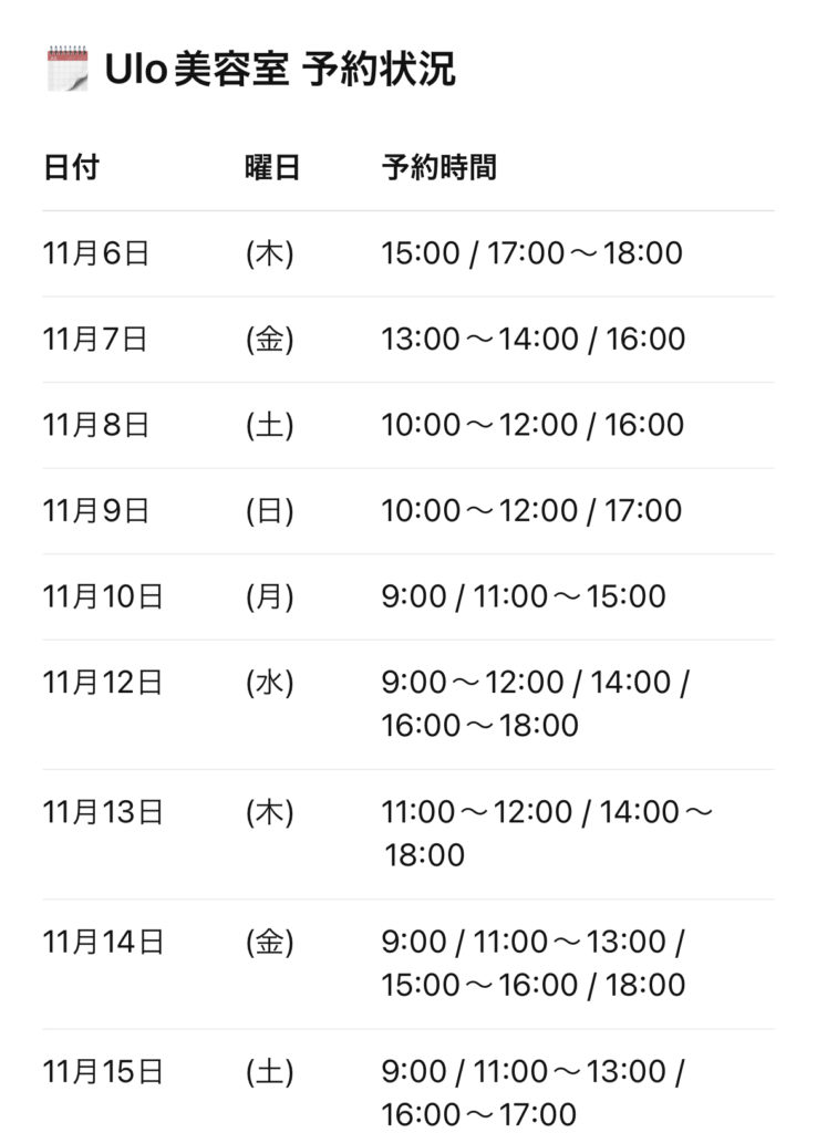🗓 Ulo美容室 予約状況